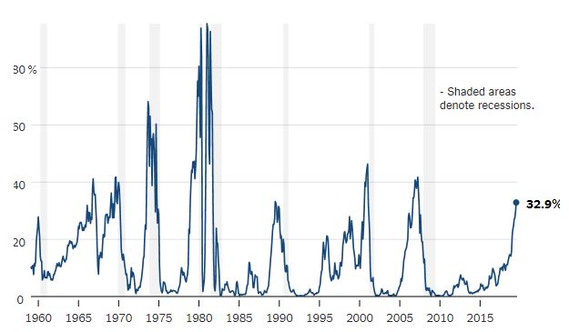 – La curva de rendimiento: se produce cuando las tasas de interés de los bonos del Tesoro a 10 años caen por debajo de las de los bonos a 3 meses. La curva de rendimiento es menos intuitiva que la tasa de desempleo, pero históricamente ha estado entre los mejores predictores de recesión, ya que la curva muestra esencialmente la diferencia entre la tasa de interés de los bonos gubernamentales a corto y largo plazo. Cuando las tasas de interés a largo plazo caen por debajo de las de corto plazo, se dice que la curva de rendimiento se ha «invertido». Piense en la curva de rendimiento como una medida de la confianza de los inversores en la economía. En tiempos normales, exigen tasas de interés más altas a cambio de amarrar su dinero por períodos más largos. Cuando se ponen nerviosos, están dispuestos a aceptar tasas más bajas a cambio de la oferta inigualable de bonos de seguridad. El Banco de la Reserva Federal de Nueva York ha desarrollado una métrica útil que traduce las fluctuaciones en la curva de rendimiento en probabilidades de recesión. En este momento, la posibilidad de que comience una recesión a partir del año próximo es de aproximadamente una de cada tres.