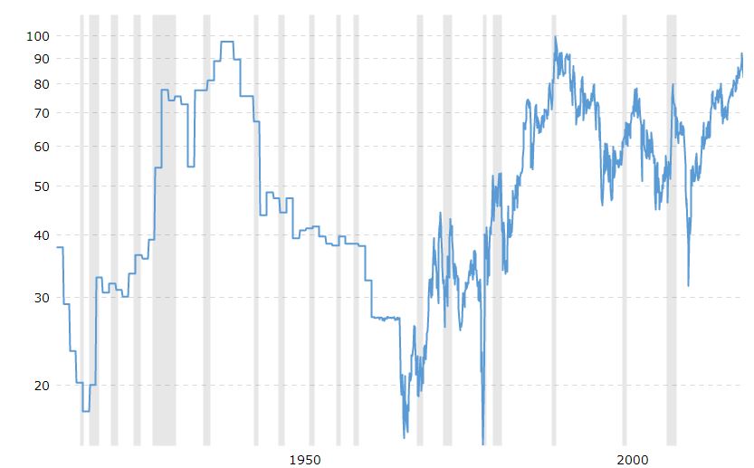 En momentos de incertidumbre los inversores optan por comprar oro, por lo que el ratio sube (es lo que pasa hoy en día y lo que sucedió con la crisis de 2008). Marcó un máximo de 100 en en año 1991 con la Guerra del Golfo. La media de los últimos 20 años es de 60.