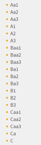 Su sistema se basa en letras y números que miden la solvencia del ente. Las letras van de la A a la C, a veces acompañadas de aa en minúsculas, siendo la A la mejor calificación y la C la peor. A cada calificación de letras se les añade un número del 1 al 3.