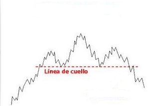 Si trazamos una línea que una los suelos o mínimos de la figura, obtendremos lo que se denomina neckline o línea clavicular y cuando el precio pierde esta zona se activará oficialmente la señal de giro o cambio de tendencia y se habrá activado la señal de venta y de caída.