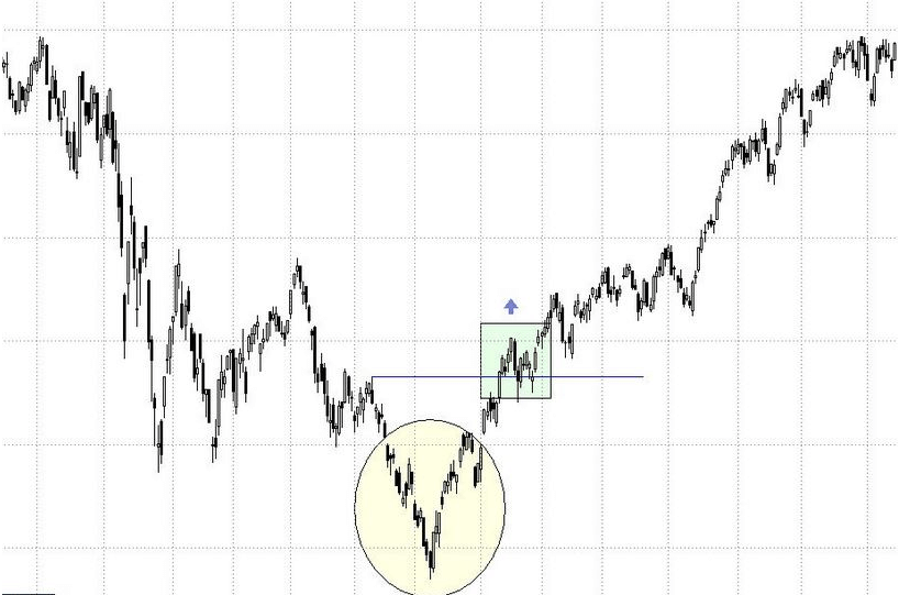 Respecto al tema del volumen, decir que cuando se forma el suelo de mercado, es decir, cuando el precio llega al final de la caída, se produce un aumento fuerte del volumen que se confirma también con el inicio de la tendencia alcista y las posteriores subidas del precio.