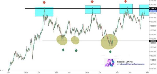 La pasada semana comenté en mi membresía que iba a intentar un nuevo ataque a la resistencia de los 2013,5 dólares y si la rompía implicaría tener camino abierto a los 2050 dólares como siguiente objetivo. Pues así fue, la rompió y llegó justo a 2050 dólares.