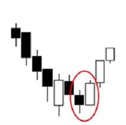 Aparece una vela blanca de cuerpo  grande y luego aparece una vela de cuerpo pequeño completamente envuelta por el cuerpo de la vela grande anterior. Si el color de esta segunda vela pequeña es negro será más fiable aún el patrón.