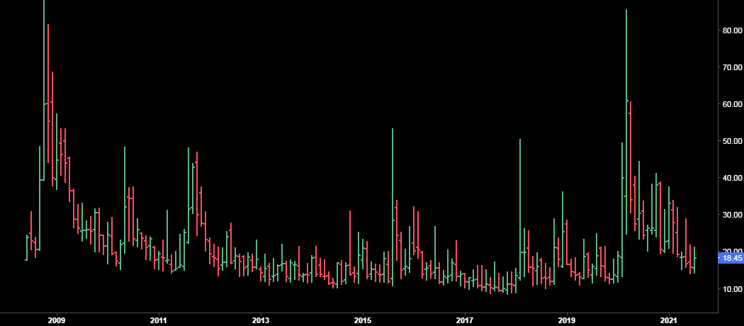 Bien, pues todo esto nos lleva al índice Vix, creado en el año 1993, uno de los más relevantes en el mundo de la bolsa para medir la volatilidad, ya que se basa precisamente en la propia volatilidad de las opciones de corto plazo del S&P500. No voy a entrar a explicar la mecánica ni cómo se obtiene el dato, ya que es complejo, mejor vayamos a lo que realmente interesa a los inversores.