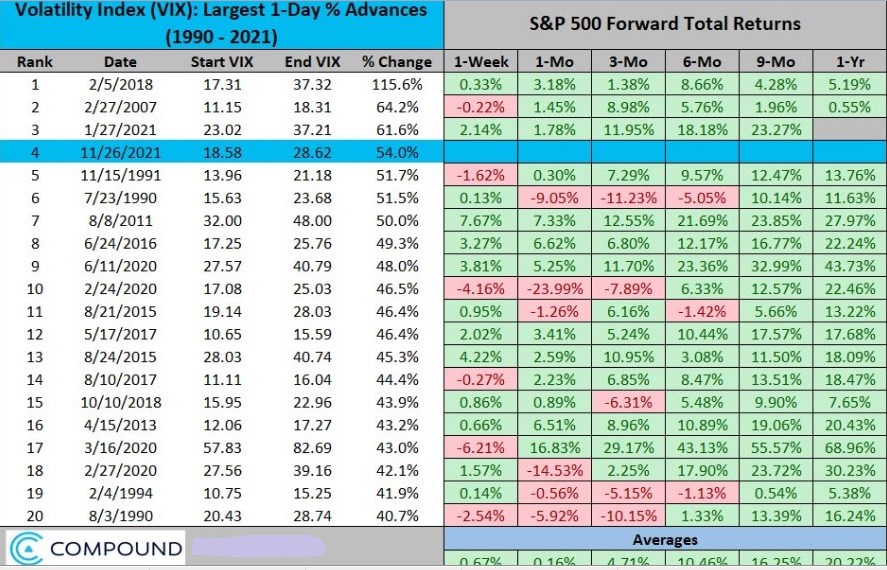 Le dejo el siguiente gráfico donde aparecen los 20 días con mayor volatilidad, lo que subió el Vix ese día, y lo que hizo el S&P500 1 semana después y 1, 3, 6, 9 y 12 meses después: