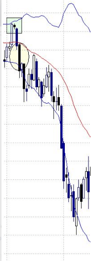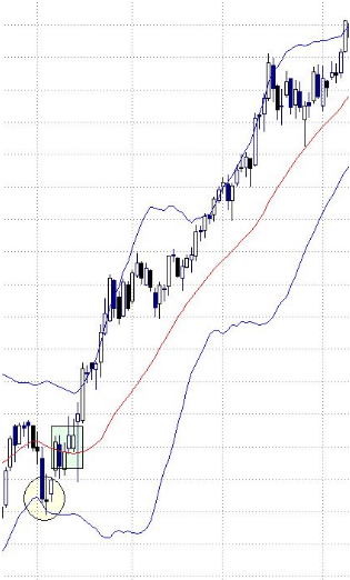 En el gráfico se ve cómo el precio toca la banda superior de Bollinger (señalado con un recuadro) y rebota a la baja, hecho que después queda confirmado con la rotura de la media móvil simple hacia abajo (señalado con un círculo).